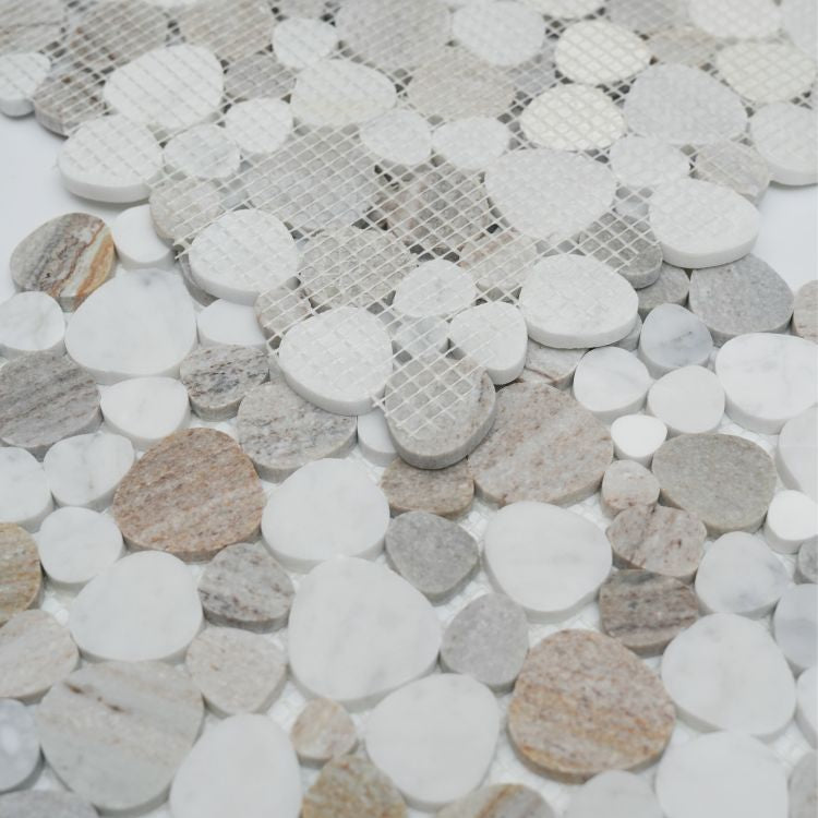 The "Floating" Backsplash: Run this mosaic from the countertop to the ceiling. The mix of Carrara and Wood-Grain creates a neutral "textural wall" that complements both modern white and traditional wood cabinetry.