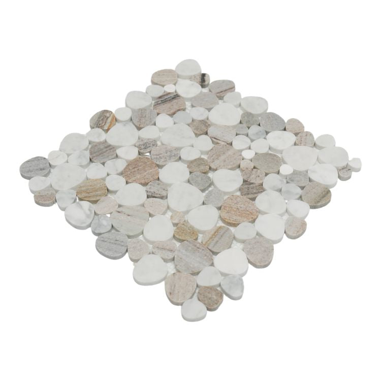 The 12" x 12" dimensions are engineered with a "jigsaw" edge that disappears once installed. This ensures the romantic, scalloped pattern remains unbroken across the entire wall. The Grain palette offers a sophisticated tonal play: the classic, misty-grey veining of Italian Carrara provides a timeless anchor, while the linear, fossil-like textures of the Crystal Wood Grain marble add a layer of organic warmth and architectural depth.