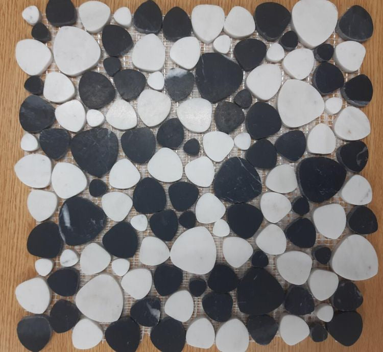 Inspired by the iconic "Panda White" marble, this stunning 12 x 12 inch mosaic tile features crisp white and deep black contrasts that create a luxurious, unforgettable visual impact. The Honed finish provides a smooth, non-reflective surface that enhances the rich texture and classic elegance of the natural stone.