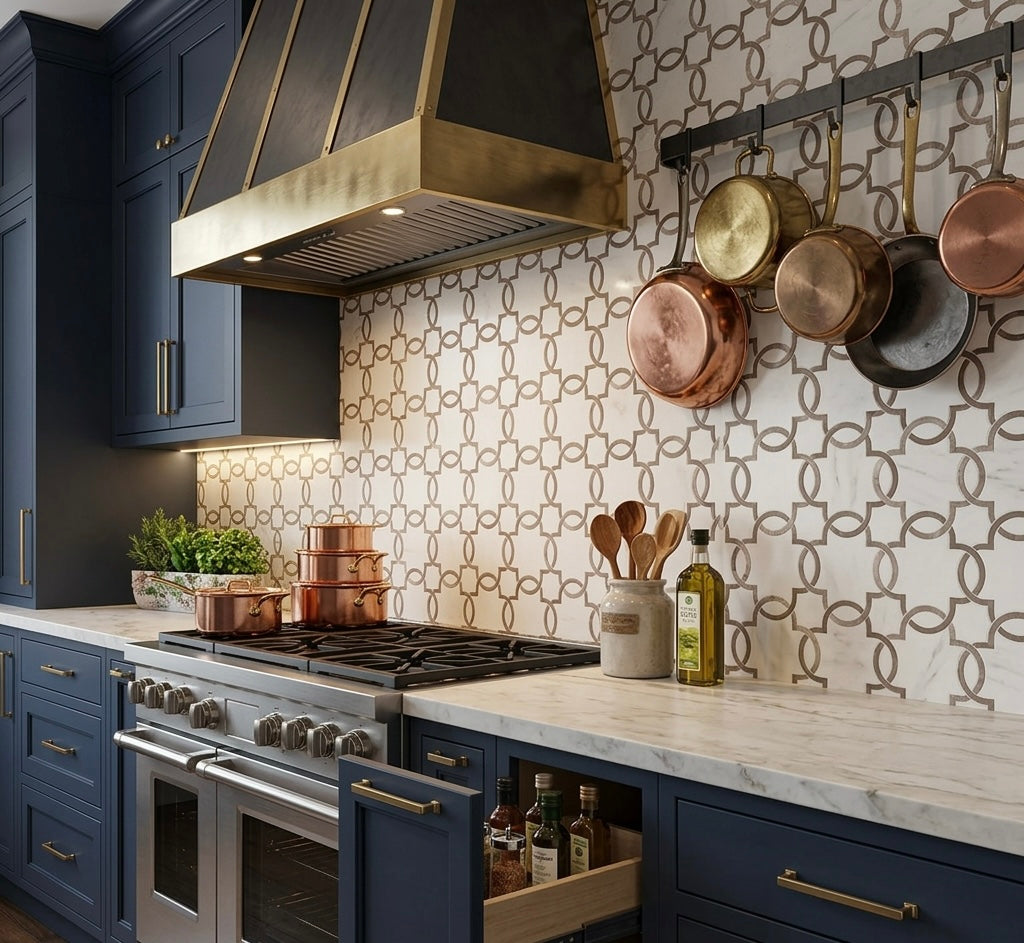 The "Boutique" Feature Wall: Run this mosaic from floor to ceiling behind a freestanding soaking tub. The quatrefoil pattern creates a powerful, romantic backdrop that mimics high-end wallpaper in stone.