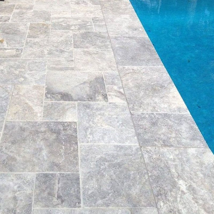 Meta Description: Shop Silver Travertine Versailles Pattern. Tumbled, non-slip finish in a classic 4-size modular set. Perfect for luxury pool decks, patios, and rustic interiors.